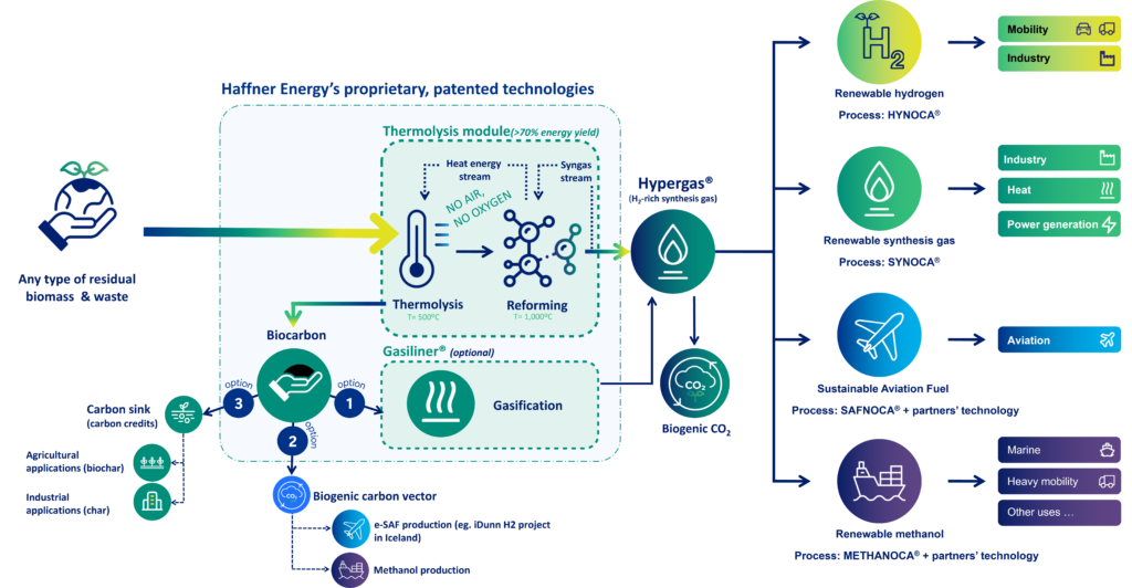 - Part of the biogenic CO2 found within the composition of the Hypergas® is used in the production of SAF or methanol through the thermolysis process